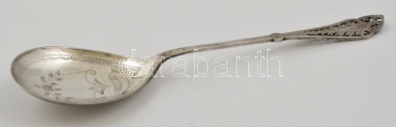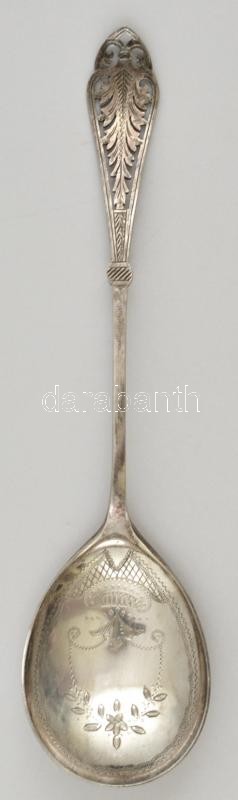 Ezüstözött díszkanál, gravírozott díszítéssel, h: 20,5 cm