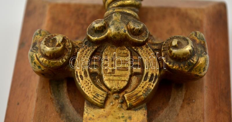 Réz dísztőr koronás kiscímer díszítéssel, fa talapzaton. h: 20,5 cm