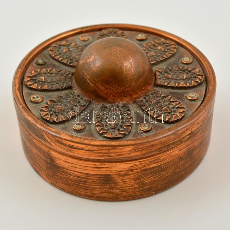 Vörösréz kör alakú, bélelt doboz, d: 10 cm