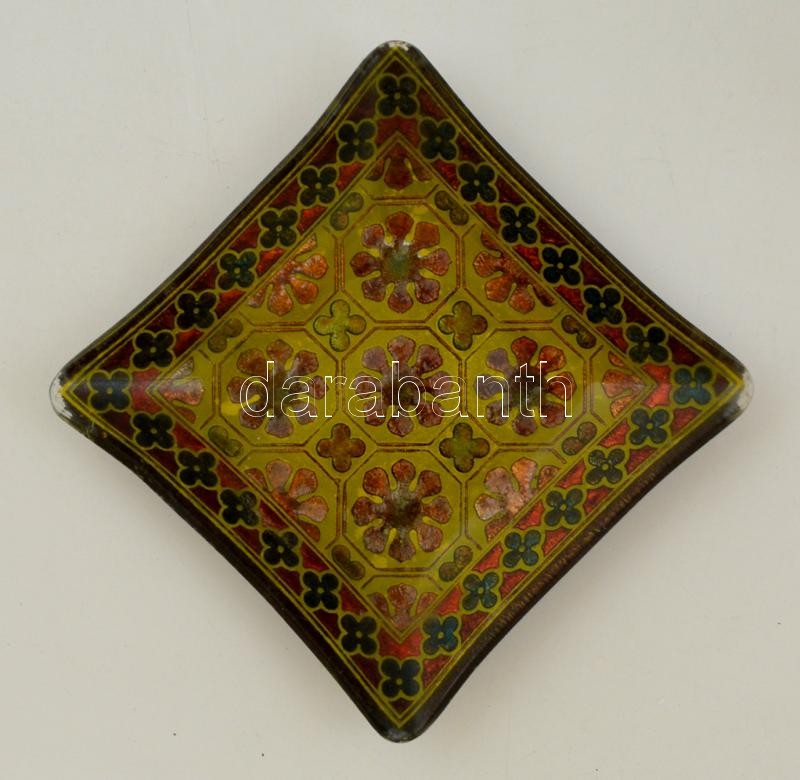 Mintás négyszögletű üveg tálka, kopással, 14x14 cm
