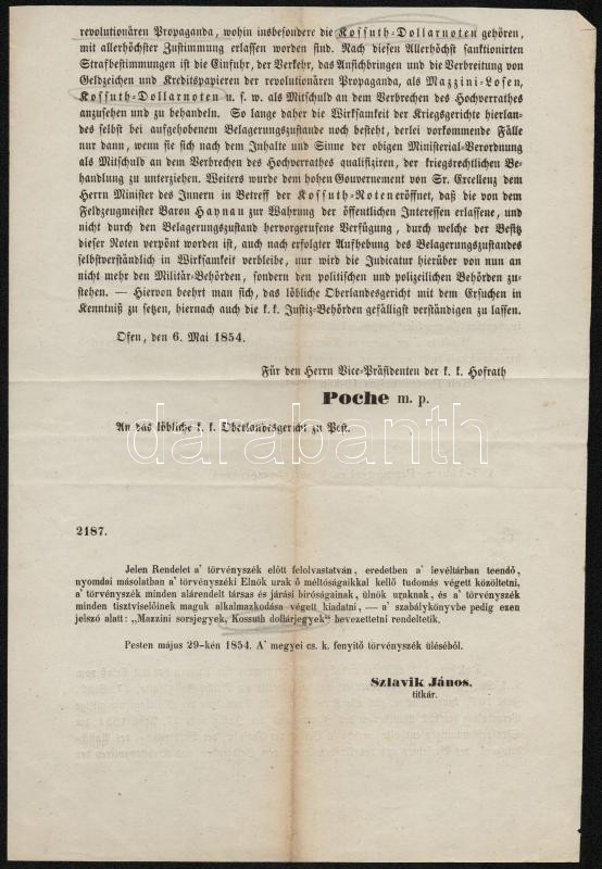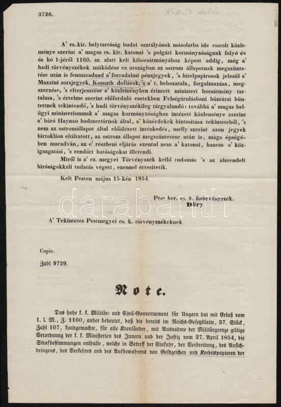 1854 Császári rendelet a Kossuth dollárok behozatalának büntethetőségéről. Két nyelven. 22x31 cm