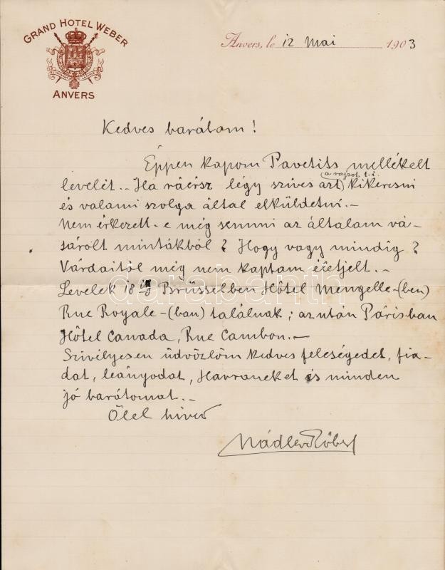 1903 Nádler Róbert (1858-1938) iparművész, festő, pedagógus saját kézzel írt levele, Dörre Tivadar (1858-1932) festőművésznek címezve, Grand Hotel Weber Anvers fejléces papíron