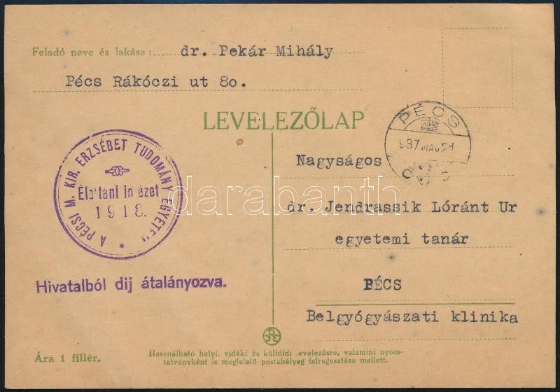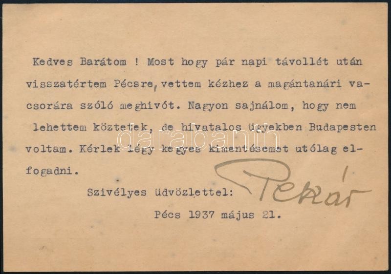 1937 Pekár Mihály (1871-1942) orvos gépelt bocsánatkérő levele Jendrassik Loránd (1896-1970) orvos részére meghívás lemondásáról, Pekár sajátkezű aláírásával