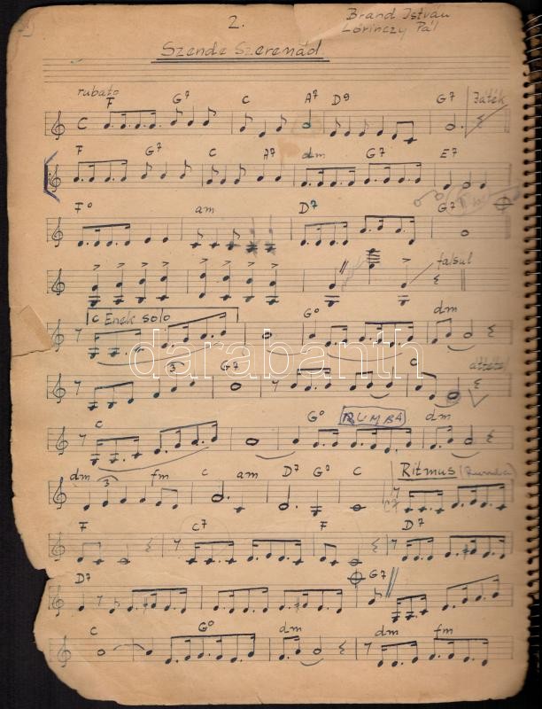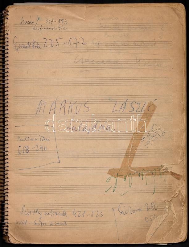 Márkus László (1927-1985) színművész kottája, többségében kézzel írt, egy része fénymásolt, spirálozott kötésben, a borítója kopottas, viseltes állapotban.