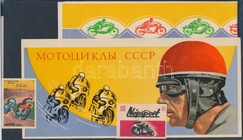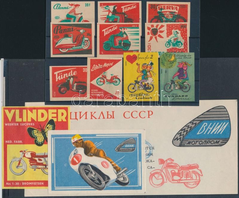 17 db motorokat ábrázoló különféle gyufacímke, köztük családi is