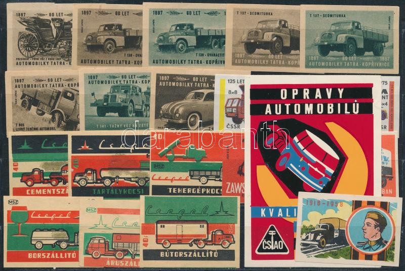 Teherautókat, főleg Csepel márkájúakat ábrázoló különféle gyufacímke, ...