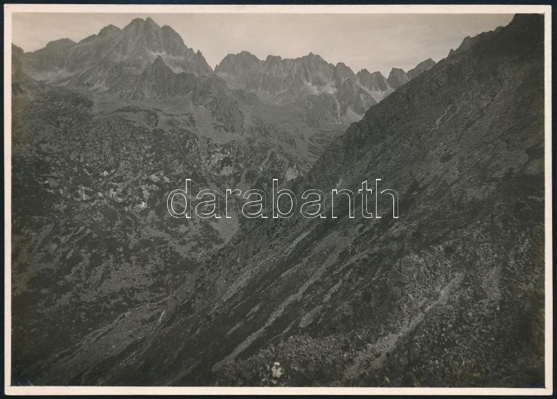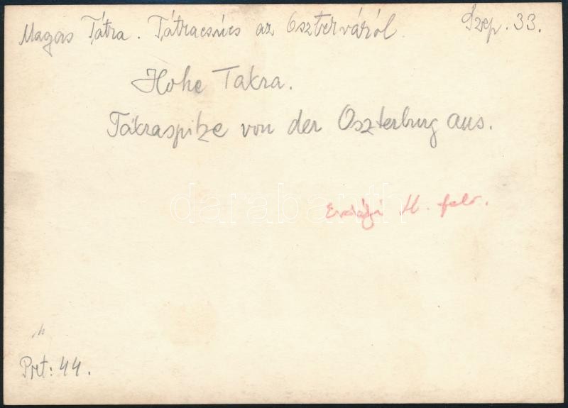 cca 1910 Magas-Tátra, a Tátra-csúcs az Oszterváról, Erdélyi Mór felvétele, hátulján feliratozva, 11,5×16 cm / cca 1910 Vysoké Tatry, the Vel'ká Vysoka from the Ostrva, vintage photo, with notes on its back, 11,5×16 cm