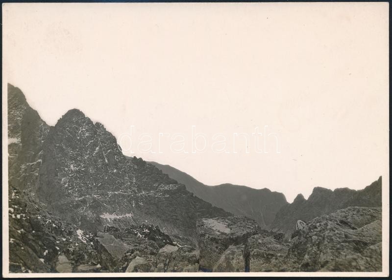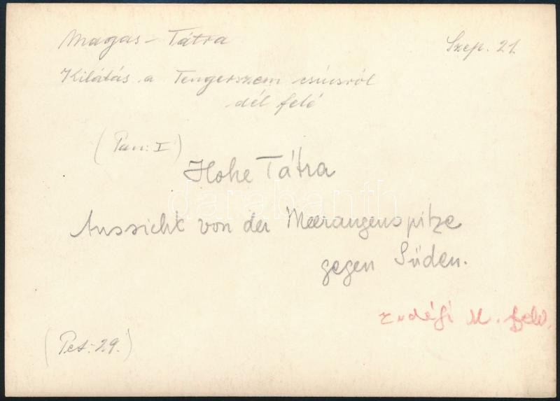 cca 1910 Magas-Tátra, kilátás a Tengerszem-csúcsról észak-dél felé, Erdélyi Mór felvétele, hátulján feliratozva, 11,5×16 cm / cca 1910 Vysoké Tatry, the view from the Rysy towards south, vintage photo, with notes on its back, 11,5×16 cm