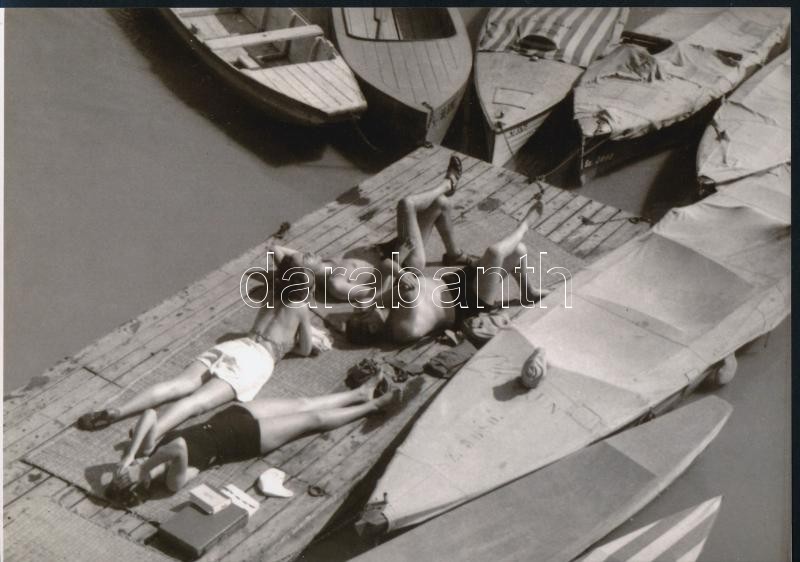 cca 1938 Szeged, napozók egy csónak kikötő stégjén, korabeli vintage felvételről készült mai nagyítás, 18x25 cm
