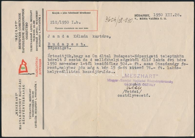 1950 MESZHART Magyar- Szovjet Hajózási Társaság fejléces levélboríték,...