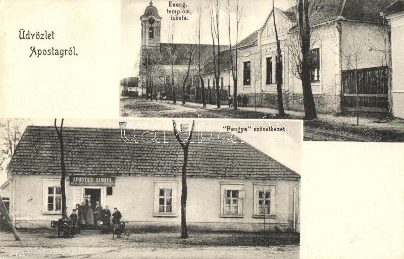 Apostag, Evangélikus templom és iskola, Hangya fogy. szövetkezet üzlet...