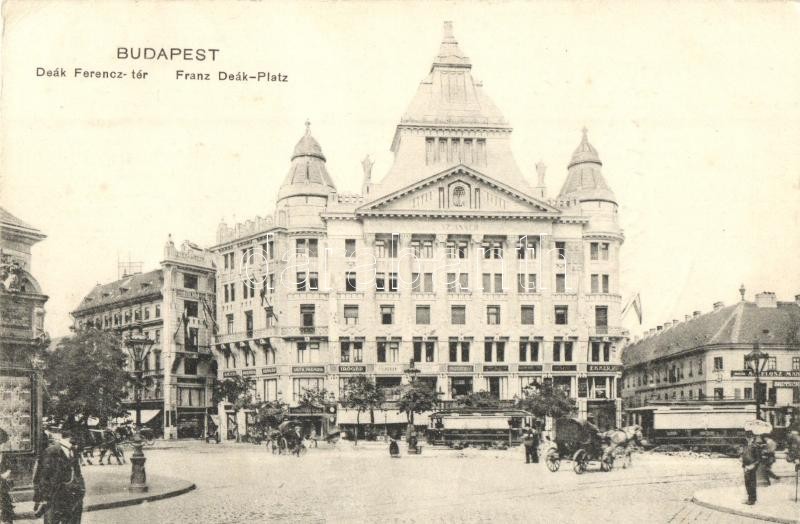 Budapest V. Deák Ferenc tér, villamosok, Angelusz Manó és Ekker üzlete...