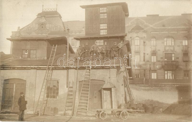 Budapest VIII. Légszeszgyár, tűzoltók gyakorlatoznak a tetőn. Háttérben a Fiume úti és Festetics utcai saroképület. photo