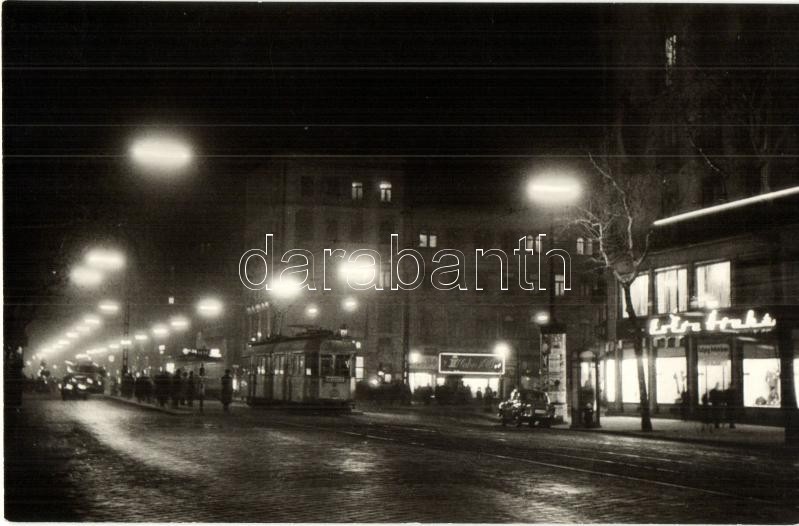 Budapest VIII. Rákóczi út este, villamos, automobil, Fővárosi Foto felvétele, Képzőművészeti Alap kiadása