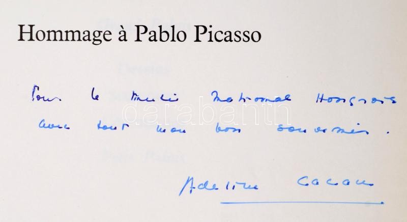 Hommage á pablo Picasso. Paris, 1966, 1967. Adeline Cacan kurátor dedikálásával. Kiadói papírkötés, kissé kopottas állapotban.