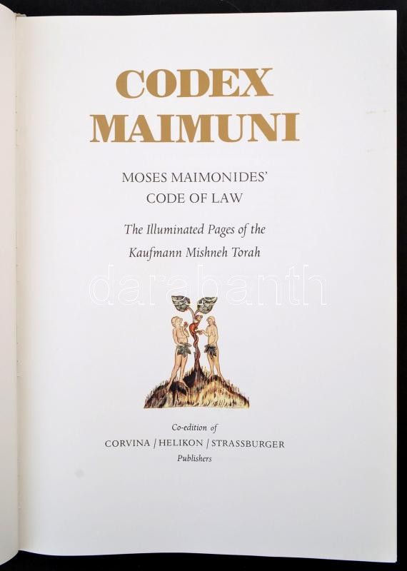 Codex Maimuni. Moses Maimonides Code of Law. The Illuminated Pages of the Kaufmann Mishneh Torah. Szerk.: Scheiber Sándor. h.n., 1984, Corvina, Helikon, Strassburger. Kiadói egészvászon-kötés, kiadói papír védőborítóban, kiadói papírtokban, angol nyelven. Szép állapotban./ Linen-binding, in paper cover, in cartoon case, in English langugage, in good condition.