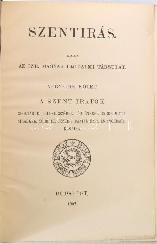 Szentírás. IV. A szent iratok. Zsoltárok, Példabeszédek, Jób, Énekek Éneke, Ruth, Siralmak, Kóhélet, Eszter, Dániel, Ezra és Nechemja Krónika. Izraelita Magyar Irodalmi Társulat Kiadványai XXIV. Budapest, 1907, Izraelita Magyar Irodalmi Társulat, 494 p. Kopottas egészvászon kötés, márványozott lapélekkel.