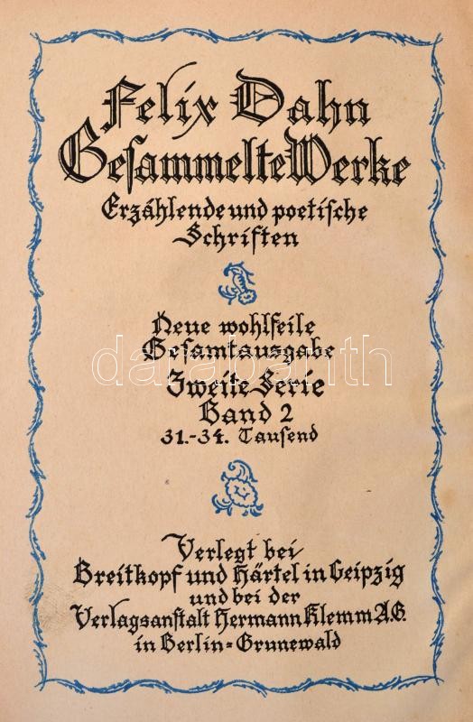Félix Dahn Gesammelte Werke 2. kötet. Leipzig-Berlin-Grunewald, é..n, Breitkopf und Härtel-Hermann Klemm. Kiadói félvászon-kötés, kopottas borítóval, kissé viseltes gerinccel, német nyelven./Half-linen-binding, with a worn cover,with a little bit poor spine, in German language.