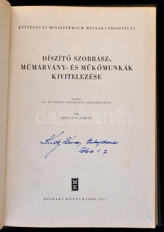 Serény János: DÃszÃtÅ‘ szobrász-, műmárvány- és műkÅ‘munkák kivitelezése. Bp., 1956, Műszaki Könyvkiadó. Kiadói kissé kopottas egészvászon-kötés, fekete-fehér fotókkal illusztrálva.