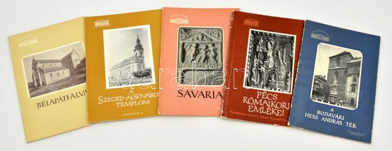 Vegyes helytörténeti tétel, Műemlékeink sorozat 5 kötete: Fülep Ferenc: Pécs rómaikori emlékei. Kádár Zoltán-Balla Lajos: Savaria. Bálint Sándor: A Szeged-alsóvárosi templom. Gergelyffy András: Bélapátfalva. Lócsy Erzsébet: A budavári Hess András tér. Bp., 1958-1966, Képzőművészeti Alap-Pannonia. Kiadói papírkötés.