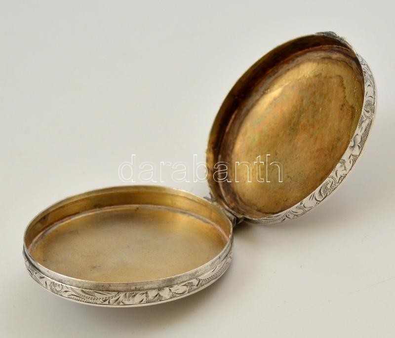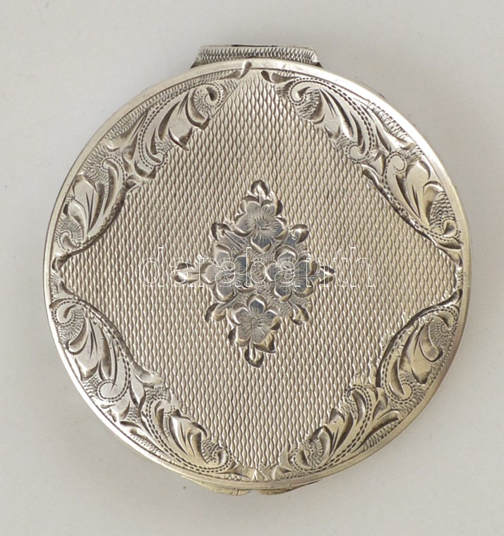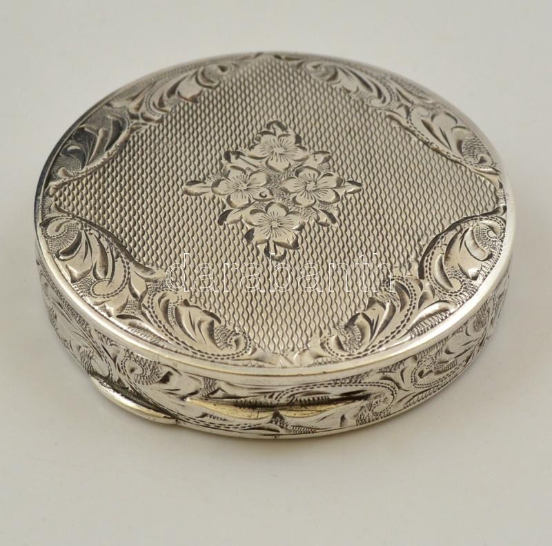 Ezüst(Ag) árvácskás doboz, jelzett, d: 5 cm, nettó: 17,8 g