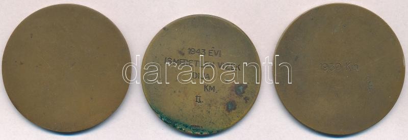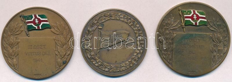 Description: 1941. "OTK - III. oszt. Virtus Díj 1941" részben zománcozott Br díjérem (50mm) + 1942. "OTK - III. Oszt. Kilométer Díj 1942" részben zománcozott Br díjérem (50mm) + 1943. ""O.M.K.SZ. (Országos Magyar Kajak Szövetség) / 1943 évi Ismeretlen Vizek Díja Km. II" Br díjérem (46mm); mindhárom "BERÁN N. BPEST" gyártói jelzéssel T:2patina