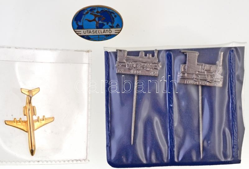 4db-os jelvény és kitűző tétel, benne "Utasellátó" zománcozott jelvény, utasszállító repülőgépet ábrázoló aranyzott kitűző és 2db, a Közelekdési Múzeumból származó, mozdonyt ábrázoló, ezüstözött emlékkitűző T:1-,2 egyiken rögzítőhiány