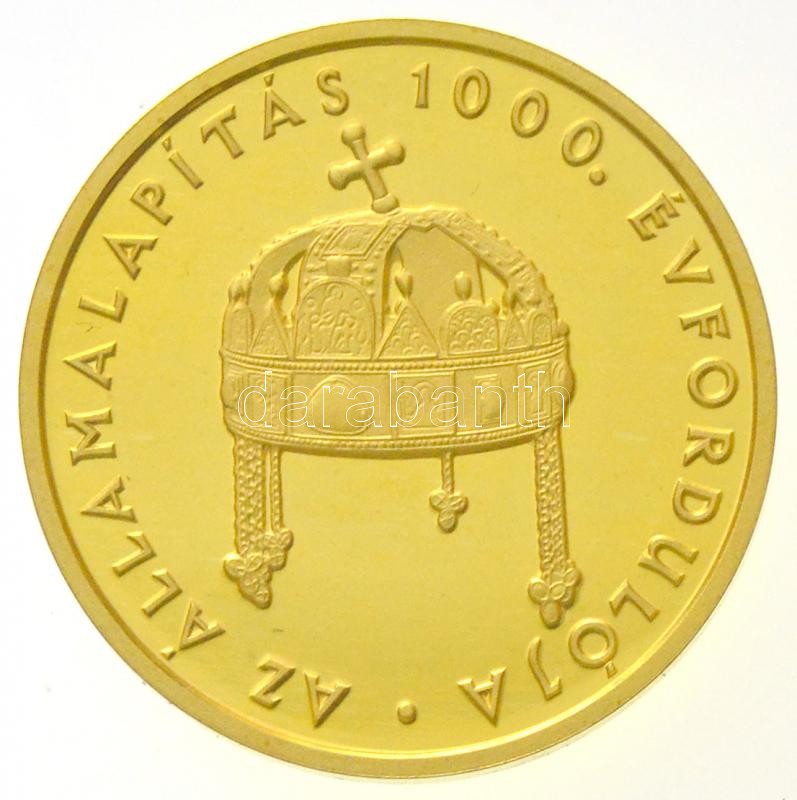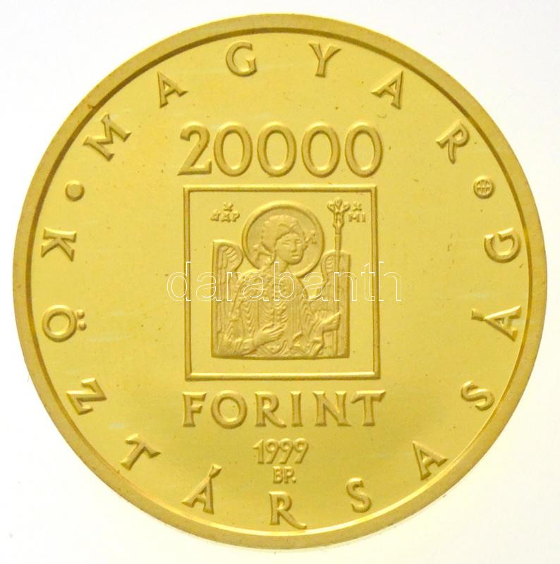 1999. 20.000Ft Au "Államalapítás 1000. évfordulója" (7g/0.98... https://www.darabanth.com/en/299-Online-auction/299.0/Numismatics/Gold-coins-and-commemorative-medallions~400011/1999-20000Ft-Au-Allamalapitas-1000-evforduloja-7g098622mm-TPP-feluleti-karc---Hunga~II1584304
