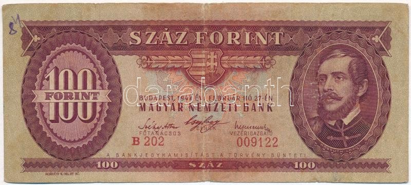 https://www.darabanth.com/en/299-Online-auction/299.0/Numismatics/Hungarian-Banknotes~400007/1947-100Ft-TIII-III-hajtas-menten-szakadas--Adamo-F27~II1590858