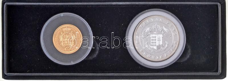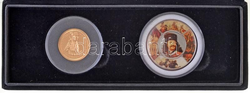 Description: DN "Történelmi éremszett II. Rákóczi Ferenc fejedelemségéről" 2db-os éremszett, tanúsítvánnyal, dísztokban, ráragasztva "21"-es számmal, benne: "Magyar aranypénzek utánveretben - II. Rákóczi Ferenc arany, 1707" aranyozott Ag emlékérem (5,5g/0.333/25mm) + DN "A Magyar Pénz Krónikája" hátoldala festett multicolor (20g/0.333/38,61mm) T:PP