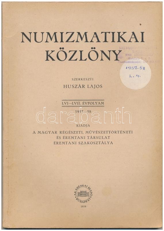 Description: Huszár Lajos (szerk.): Numizmatikai Közlöny LVI-LVII. évfolyam 1957-1958. Magyar Régészeti, Művészettörténeti és Éremtani Társulat Éremtani Szakosztálya, Budapest 1958.