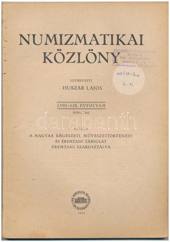 Description: Huszár Lajos (szerk.): Numizmatikai Közlöny LVIII-LIX. évfolyam 1959-1960. Magyar Régészeti, Művészettörténeti és Éremtani Társulat Éremtani Szakosztálya, Budapest 1960.