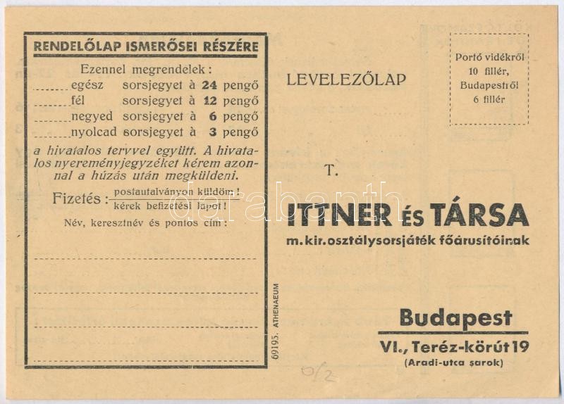 1935. "Ittner és Társa m. kir. osztálysorsjáték főárusítói" ... https://www.darabanth.com/en/299-Online-auction/299.0/Numismatics/Numismatics-documents-and-letters~400003/1935-Ittner-es-Tarsa-m-kir-osztalysorsjatek-foarusitoi-kitoltetlen-levelezolapos-hir~II1603037