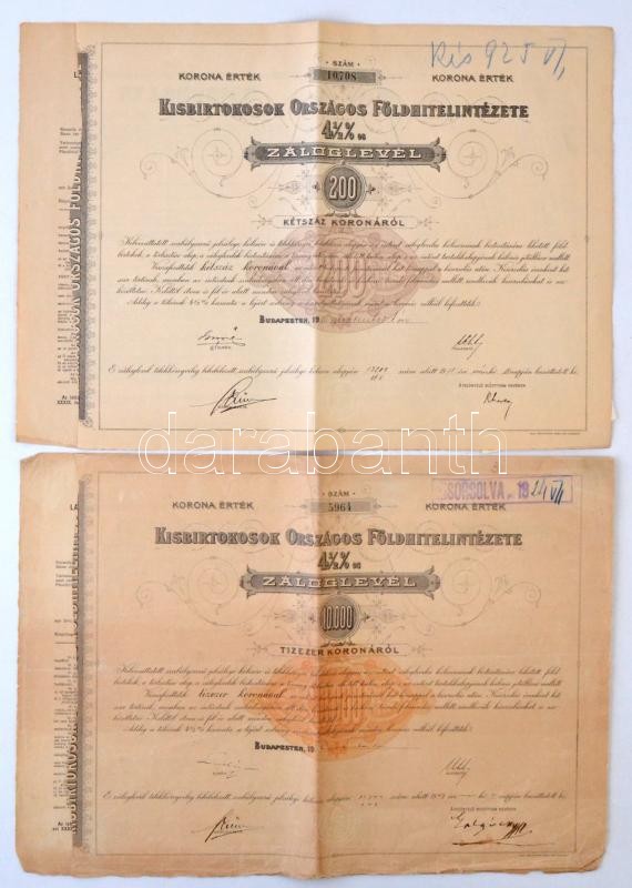 Budapest 1910. "Kisbirtokosok Országos Földhitelintézete" 4 1/2%-os záloglevele 200K-ról, magyar, német és francia nyelven, szárazpecséttel és szelvényekkel, vízjeles papíron + 1911. "Kisbirtokosok Országos Földhitelintézete" 4 1/2%-os záloglevele 2000K-ról, magyar, német és francia nyelven, szárazpecséttel és szelvényekkel, vízjeles papíron+ 19?6. "Kisbirtokosok Országos Földhitelintézete" 4 1/2%-os záloglevele 10.000K-ról, magyar, német és francia nyelven, szárazpecséttel és felülbélyegzéssel, vízjeles papíron T:II-,III