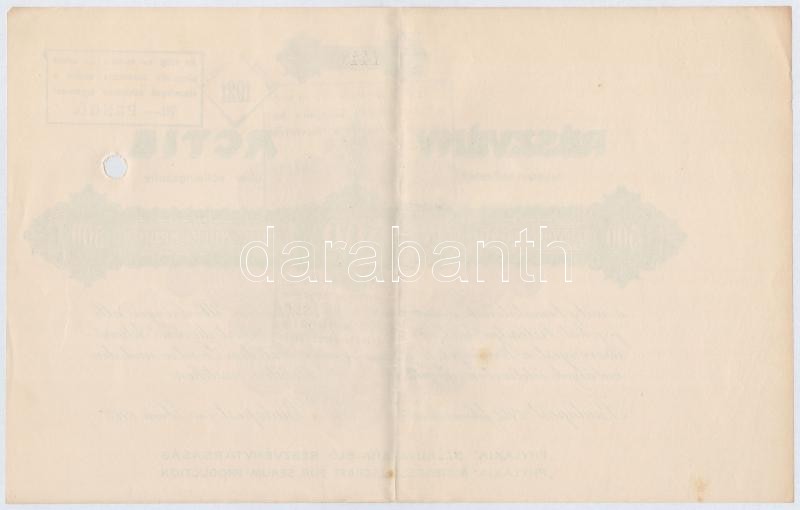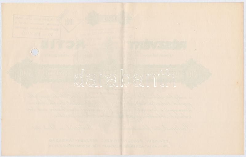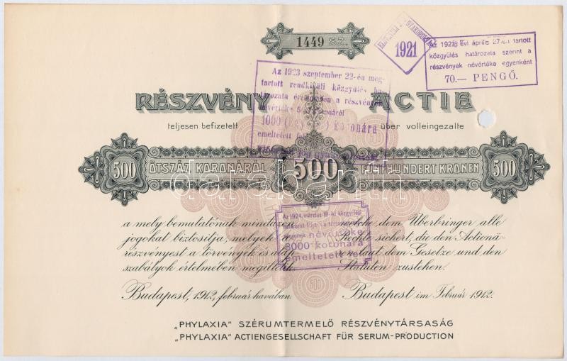 Description: Budapest 1912. "Phylaxia Szérumtermelő Részvénytársaság" részvénye 500K-ról, magyar és német nyelven, felülbélyegzésekkel, lyukasztással érvénytelenítve (2x) sorszámkövetők T:II,II-