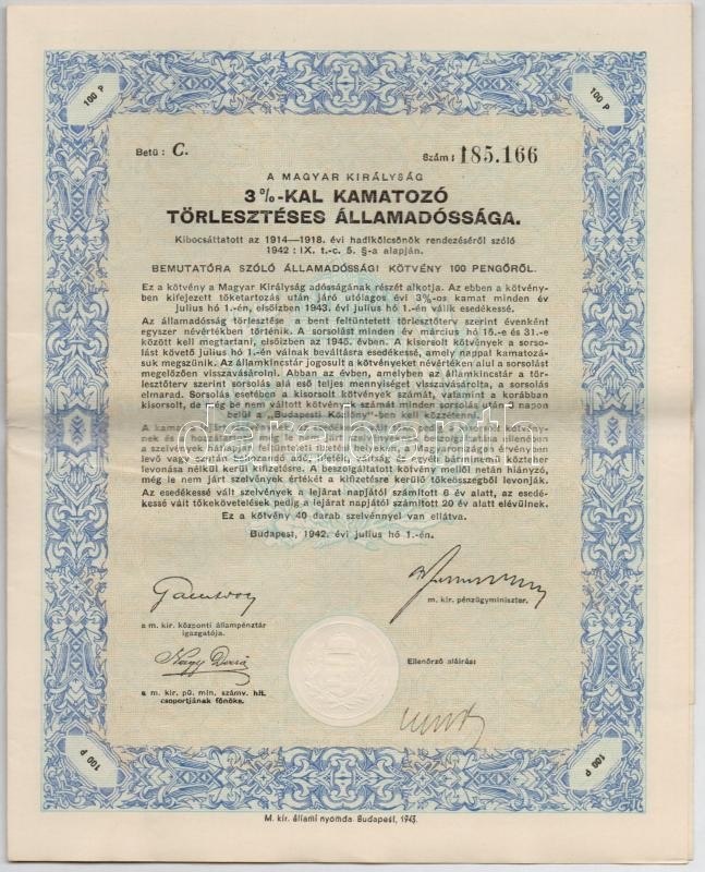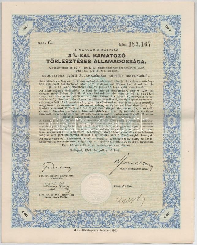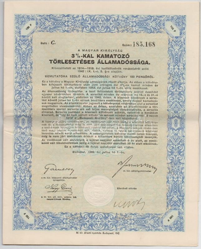 Budapest 1942. "A Magyar Királyság 3%-kal Kamatozó Törlesztéses Á... https://www.darabanth.com/en/299-Online-auction/299.0/Numismatics/Shares-and-Tickets~400005/Budapest-1942-A-Magyar-Kiralysag-325-kal-Kamatozo-Torleszteses-Allamadossaga-kotvenye-10~II1591076