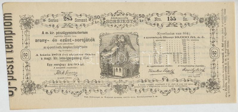 Description: Budapest / Pest 1873. "A Magyar Királyi Pénzügyminisztérium arany- és ezüst sorsjátéka az Újpesti Katolikus Templom felépítésének javára" 50kr értékben T:I-