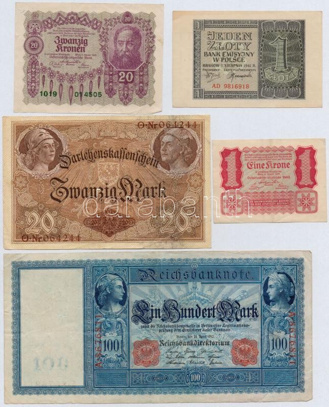 Description: Vegyes: Ausztria 1922. 1K + 20K + Lengyelország / Német megszállás 1941. 1Zl + Német Birodalom 1910. 100M + 1914. 20M hat jegyű sorszámmal T:I-,III,III-