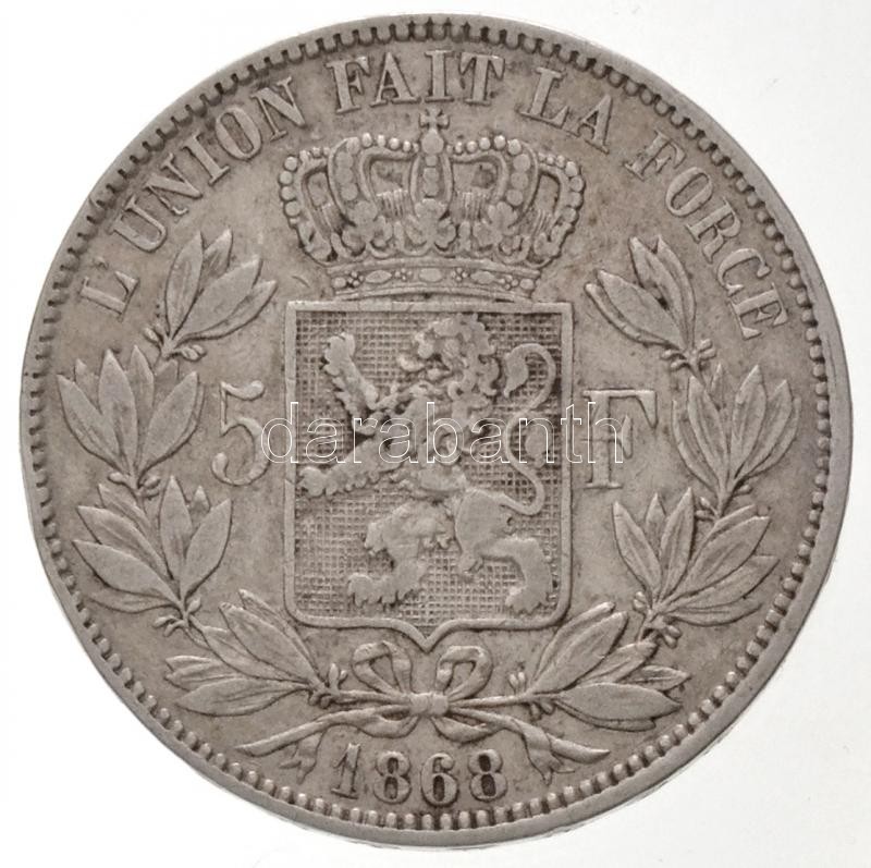 https://www.darabanth.com/en/299-Online-auction/299.0/Numismatics/Worldwide-silver-and-metal-coins~400013/Belgium-1868-5Fr-Ag-II-Lipot-T2-2-kis-ph-u--Belgium-1868-5-Francs-Ag-Leopold-II-CXF-V~II1568130