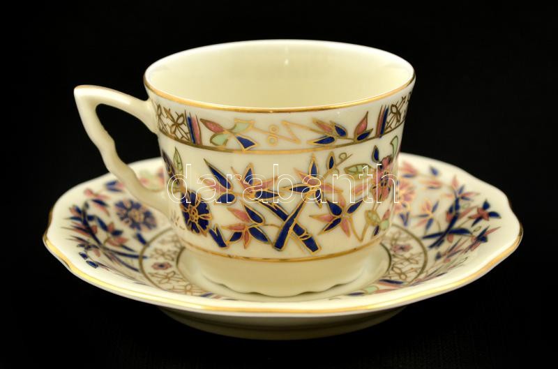 Zsolnay bambusz mintás mokkás csésze és alj, kézzel festett, jelzett