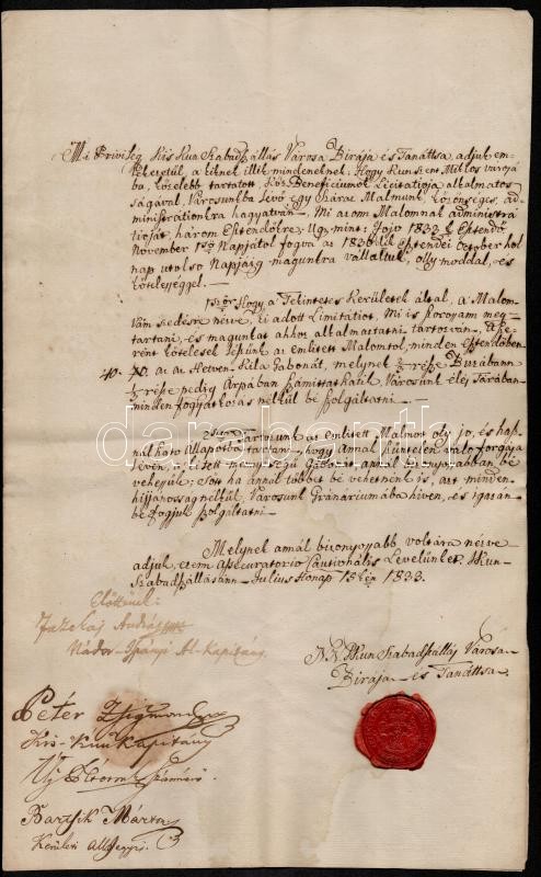 1833 Kiskunszabadszállás város szerződése a helyi száraz malom üzemeltetéséről. A városi elöljárók aláírásával és a város címeres pecsétjével
