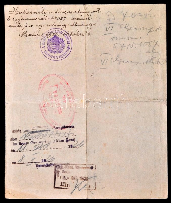 1926 Határszéli utiigazolvány határkerületbeli lakosok részére Osztrá...