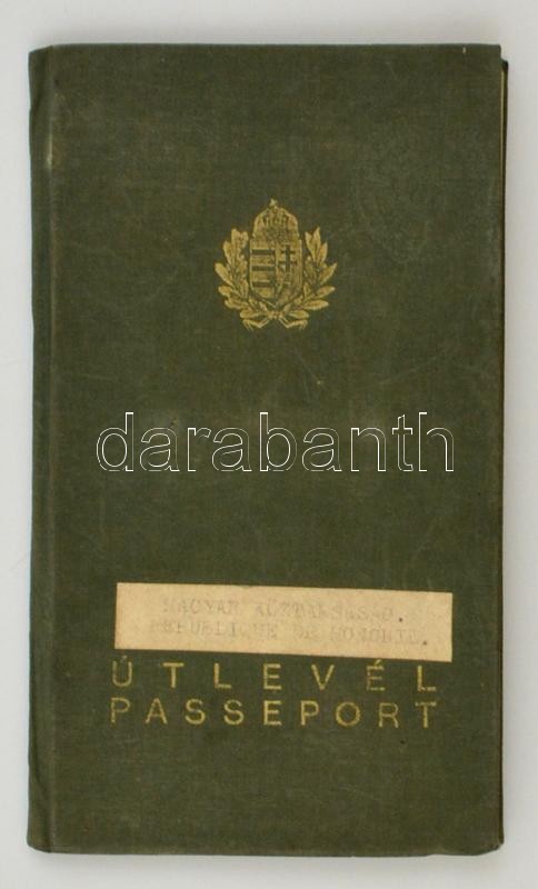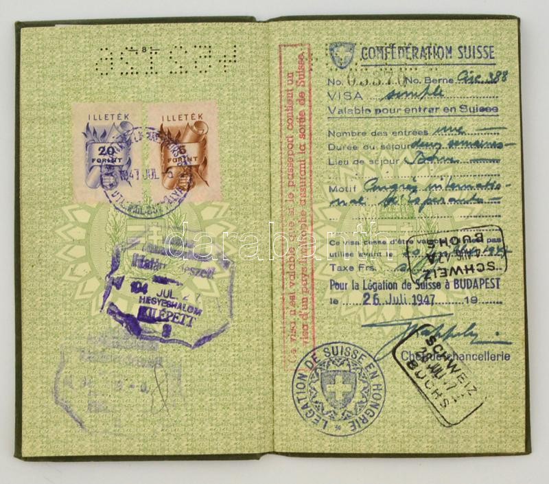 1947 Útlevél 1947 jűliusában 20 + 5 Ft illetékbélyeggel. Vászonkötéses, Magyar Királyság kiadás, a borítón a Magyar Királyság magyar.francia nyelvű papírcsíkkal átragasztva, de a szakirodalomban szereplő továbbhasznált útlevelekhez képest az alábbi eltérésekkel: