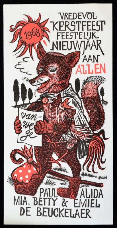 Antoon Vermeylen: Újévi, mese, farkas. Linó ex libris, / New Year Lino tales, wolf ex libris, bookplate. X3. 21x11 cm