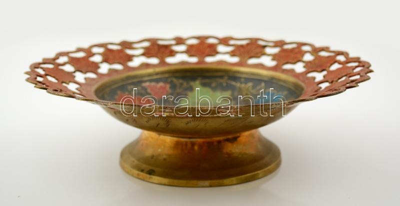 Áttört peremű réz tál, festett réz, foltos, m:6 cm, d:22 cm