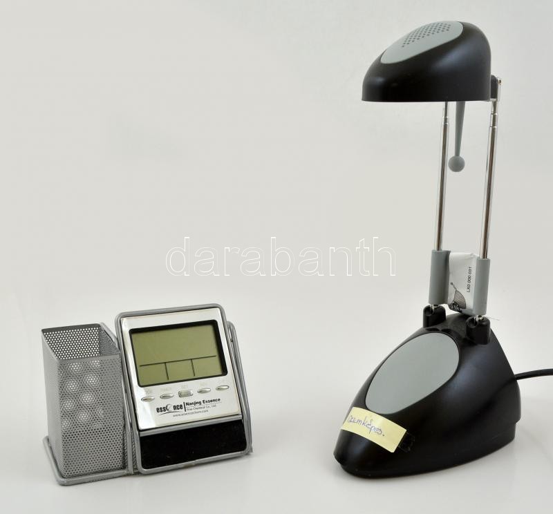 Kis bolha tétel: asztali lámpa, működőképes, állítható magasságú, m:50 cm, digitális órás ceruzatartó, elem nélkül, m:8 cm h: 13 cm