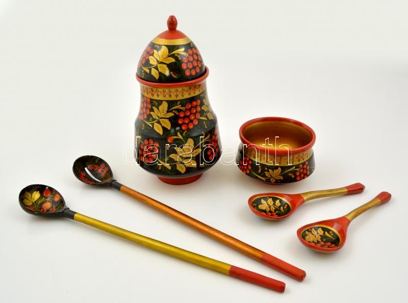 Orosz népi fakanalak, fedeles váza, cukortartó, összesen: 6 db, h: 14...