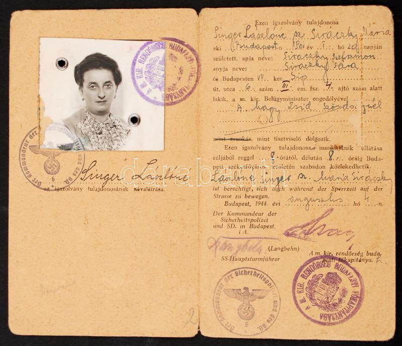 1944 Bp., A M. kir. rendőrség budapesti főkapitánya és a Magyar Zsidók Központi Tanácsa által kiadott magyar és német nyelvű igazolvány, mely igazolja, hogy a fent nevezett személy a Magyar Zsidó Szövetségnél a belügyminiszter engedélyével tisztviselőként dolgozik, szabadon mozoghat reggel 7-től 16 óráig, a sárga csillagon fekvő fekete szorzójelet köteles viselni, aláírásokkal, pecsétekkel / 1944 Picture ID for Hungarian Jew obliged to wear yellow star.