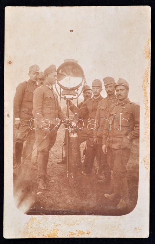 1917 Fényszóros raj, fotólap, a hátoldalon feliratozva, dátumozva, 14x8,5 cm./ 1917 Spotlamp squad, photo, with writings and date on the back, 14x8,5 cm.