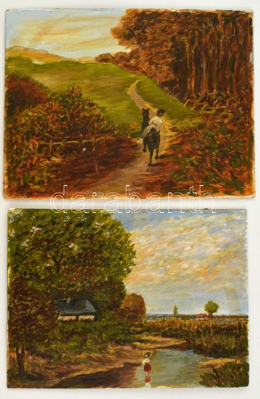 Jelzés nélkül: Lovas az úton, Lány a tó partján, 2 db. Olaj, vászon-ka...